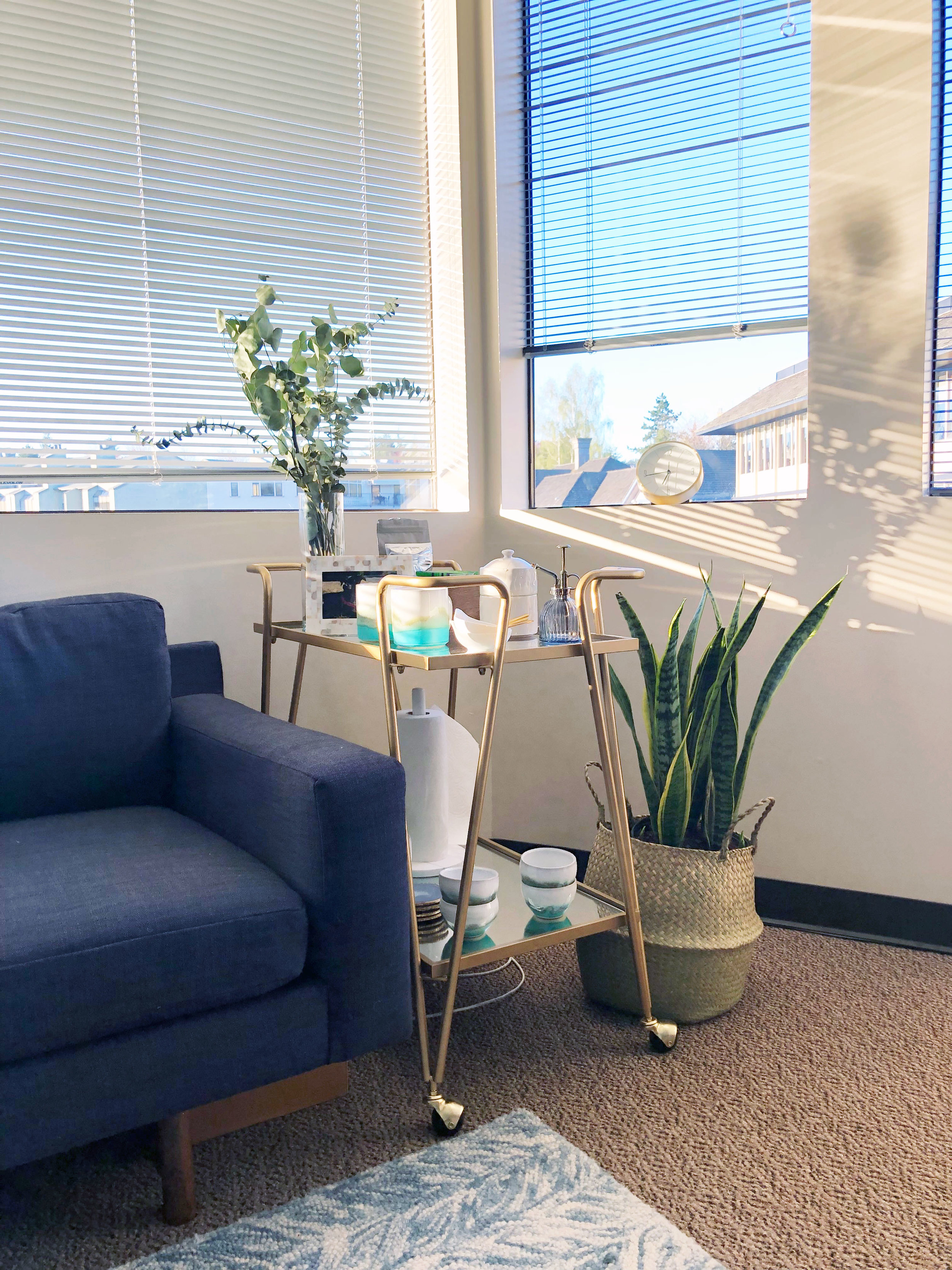When designing an office space, it’s important to think about setting the right tone. Comfort with tea, relax on simple fabrics and breathe in fresh air brought by live plants. For this therapist’s office, we played off the existing natural coastal theme and ran with it. We added luxurious wood, metal and glass textiles with a tea and coffee bar cart for people to feel right at home. It was also a great opportunity to add in handmade touches like a quirky whiteboard made from an old vintage door with a frosted glass. We also sprinkled in some sentimental keepsakes such as the artwork from the client’s travels and hanging ceramics. And of course an office wouldn’t be complete without some strategic storage solutions with the use of cabinets, custom shelving and thoughtful baskets.